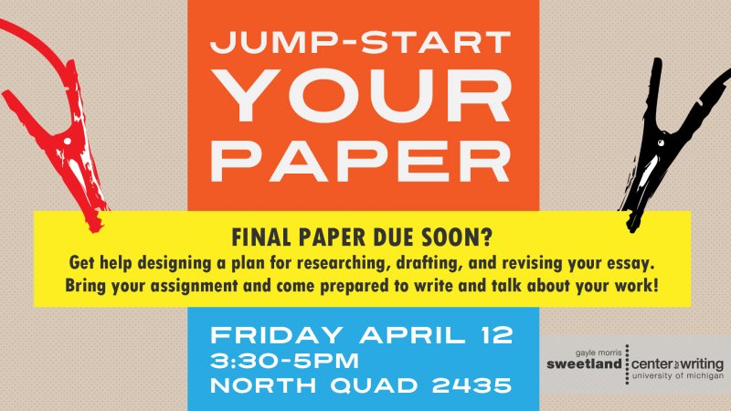 Do you have a final paper due soon? This workshop will help you design a reasonable plan for researching, drafting, and revising your essay. Bring your assignment and writing materials (pen and notebook, or a laptop), and come prepared to write and talk about your work