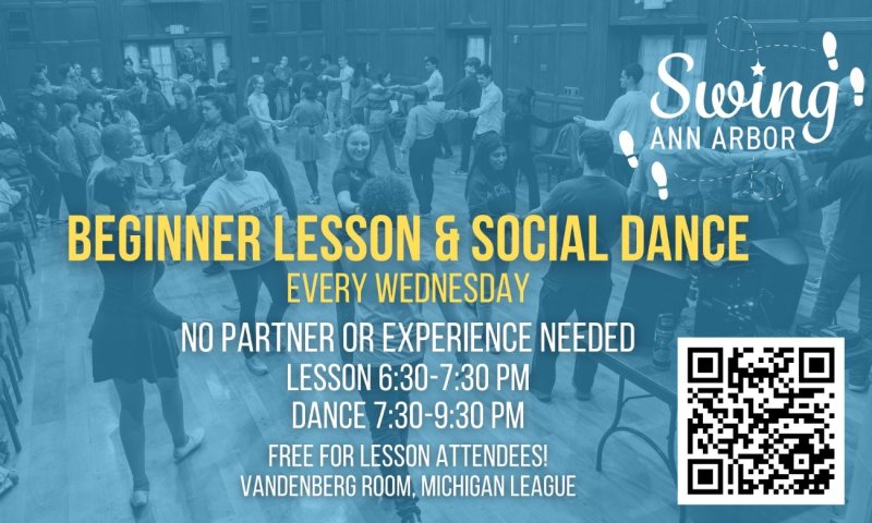 Swing Ann Arbor hosts a beginner drop-in lesson and social dance every Wednesday! No partner or experience needed. You do not need to be a student of the University of Michigan to attend. Just bring yourself and some comfy shoes! We have rotating teachers and lesson material, so come back each week to learn something new!
