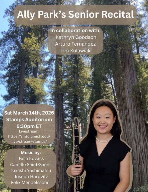 Undergraduate student Allison Park performs a final senior recital, in collaboration with Kathryn Goodson, Arturo Fernandez, and Tim Kulawiak. The program includes music by Béla Kovács, Camille Saint-Saëns, Takashi Yoshimatsu, Joseph Horovitz, and Felix Mendelssohn.