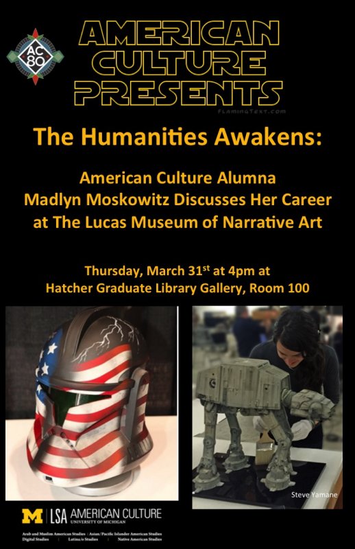 Hear U-M American Culture alumna Madlyn Moskowitz speak about her experiences working for The Lucas Museum of Narrative Art on Skywalker Ranch in California. The Lucas Museum of Narrative Art is part of George Lucas's Star Wars empire. She will talk about the museum, and career fields for American Culture majors and minors. Light refreshments.