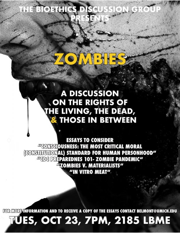 For more information and/or to receive a copy of the readings, please contact Barry Belmont at belmont@umich.edu or visit https://belmont.bme.umich.edu/bioethics-discussion-group/discussions/019-zombies/.