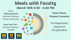 The Spectrum Center, Rackham Graduate School, and the Division of Student Life invites any and all LGBTQ+ graduate students to our new Meals with Faculty series, which have been created to give you all the opportunity to connect with LGBTQ+ faculty and researchers in the community. There is no required or preferred discipline and all are welcome no matter what you're studying. This month's faculty guests are Michael Bastedo, an Associate Professor in School of Education and Omar Sosa-Tzec, an Assistant Professor in STAMPS