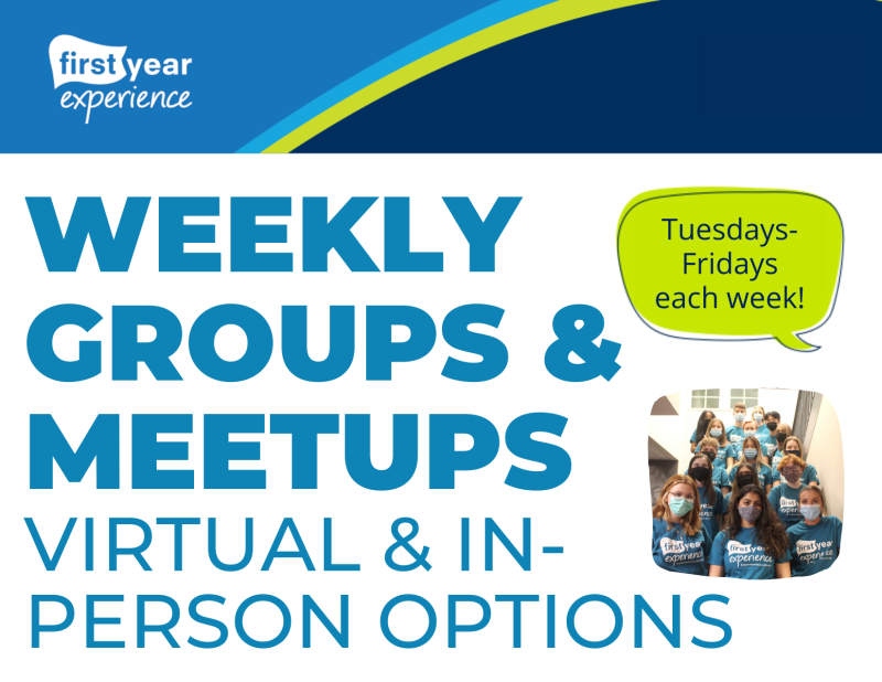 Each Thursday from 6-7PM we will have a weekly group with rotating activities. Students of all years are welcome. This is a great opportunity to build relationships with your peers! We'll play games together, focus on wellness, watch a movie/TV show, or accompany each other while we decide on an activity we'd like to do!