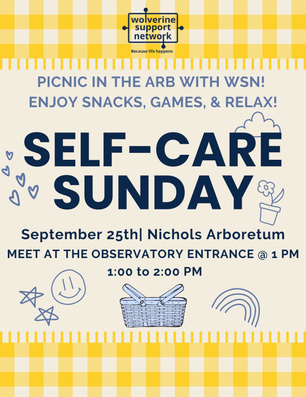 Come picnic in the Arb with WSN! Take care of yourself, meet a supportive community, and enjoy snacks, games, and more! Completely free and open to the entire UofM Community!